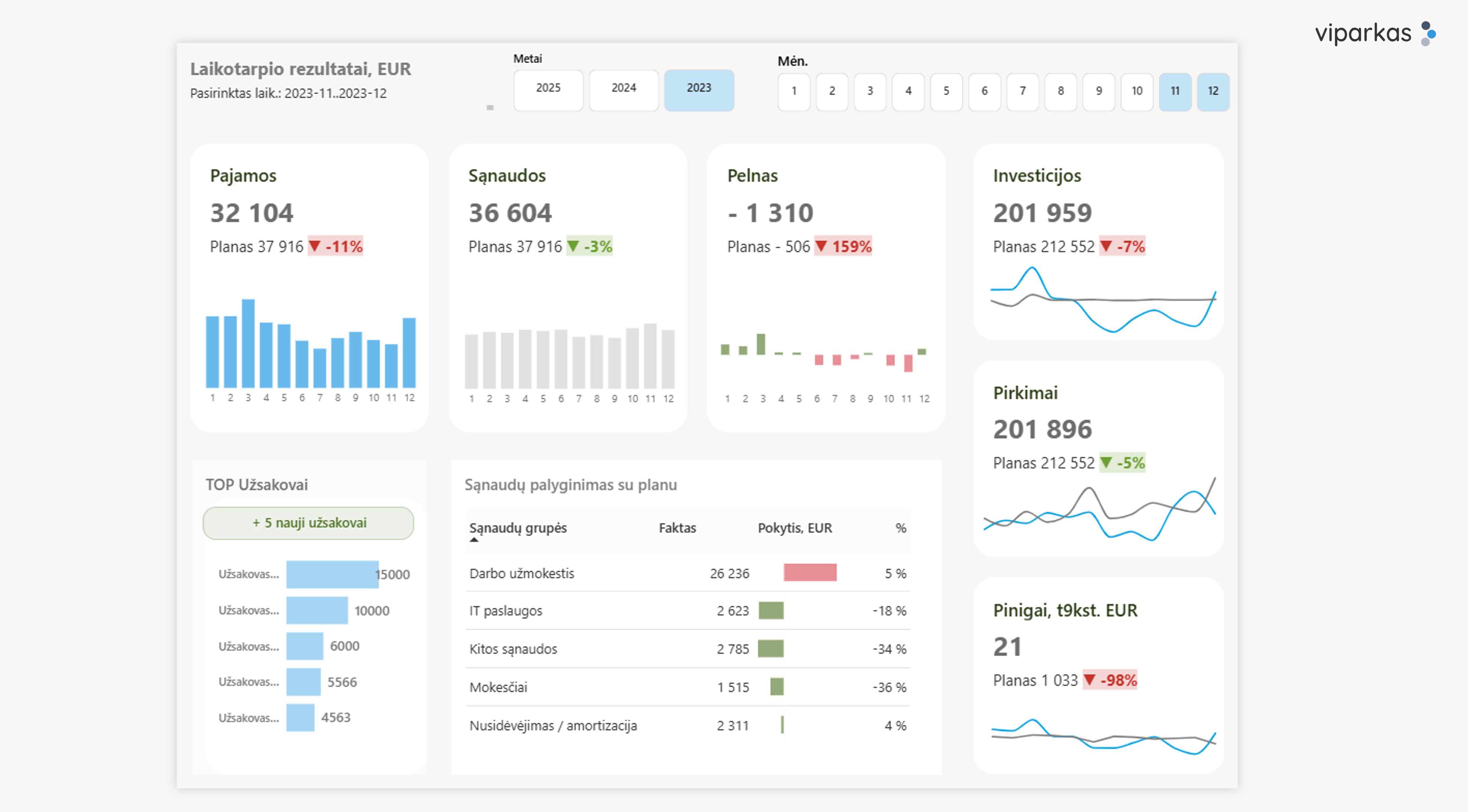 Padedame identifikuoti ir apskaičiuoti pagrindinius verslo rodiklius (KPI), matuoti jų pasiekimą, spalviniais indikatoriais vertinti būklę ir pasiekimus.